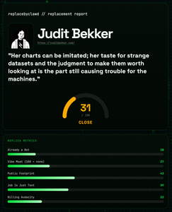 The idea to dive deeper into this topic came from the fact that I recently came across a website that would predict whether I'm already retired without me noticing. I ran it on both my split personalities: my website and on LinkedIn. It was funny to see that in my work-life, where I do all the advanced AI stuff, I'm very close to being replaced, while my supposedly extinct dataviz career path seems to be thriving compared to the automation hamster wheel.